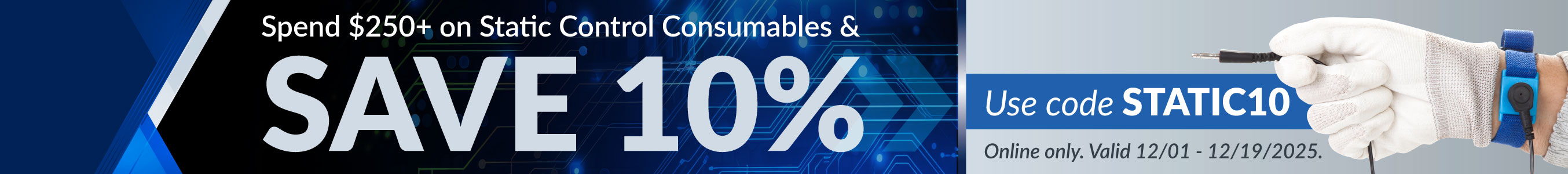 Spend $250 or more on qualifying static control consumables between 12/01-12/19/25, then enter code STATIC10 at checkout. The 10% discount will be automatically applied online.
